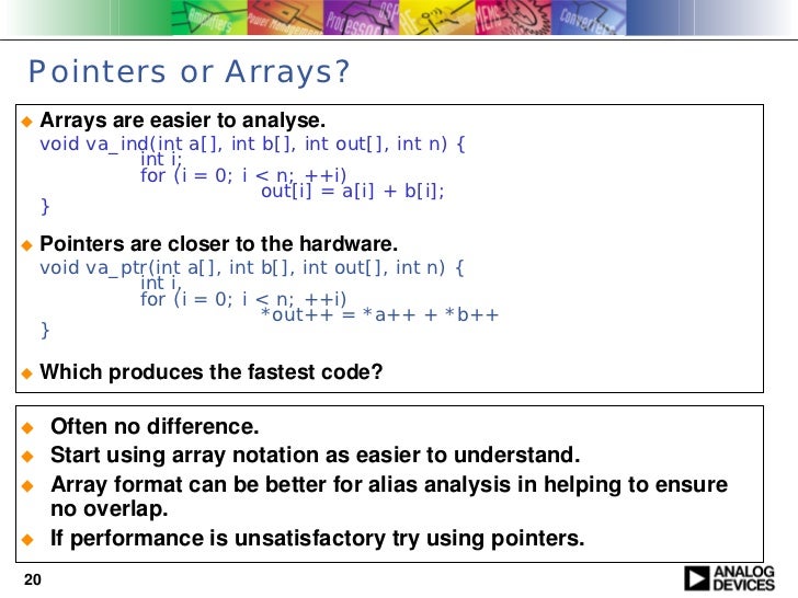 20. 20. Pointers or Arrays? Arrays are easier to analyse. void va_ind(int a[], int b[], int out[], int n) { int i; for (i = 0; i < n; ++i) out[i] = a[i] + b[i]; } Pointers are closer to the hardware. void va_ptr(int a[], int b[], int out[], int n) { int i, for (i = 0; i < n; ++i) *out++ = *a++ + *b++ } Which produces the fastest code? Often no difference. Start using array notation as easier to understand. Array format can be better for alias analysis in helping to ensure no overlap. If performance is unsatisfactory try using pointers. 20