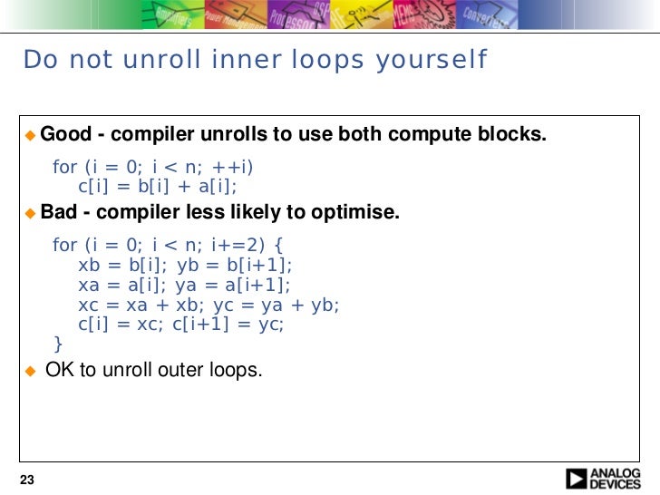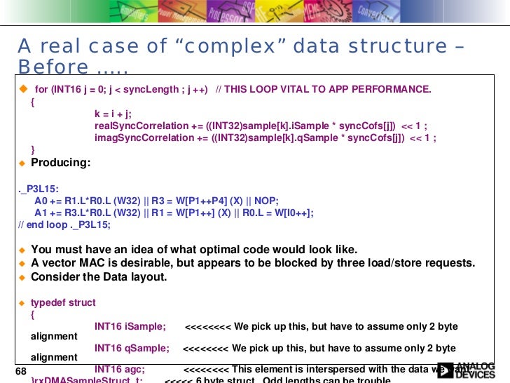 69. 69. … and After Copying data to a temp struct is cheap compared to gains. INT16 sample_iq[287*2]; // local copy of data - real and imaginary shorts consecutive. for (INT16 j = 0; j < syncLength ; j ++) { k = i + j; realSyncCorrelation += ((INT32)sample_iq[(k*2)] * syncCofs[j]) << 1 ; imagSyncCorrelation += ((INT32)sample_iq[(k*2)+1] * syncCofs[j]) << 1 ; } Producing optimal code for a single cycle loop: ._P3L15: A1+= R1.H*R3.L, A0+= R1.L*R3.L || R1 = [P0++] || R3.L = W[I0++]; // end loop ._P3L15; Note the (k*2) form. This is a particularly strong way of expressing to the compiler that the alignment will be 4 bytes. 69