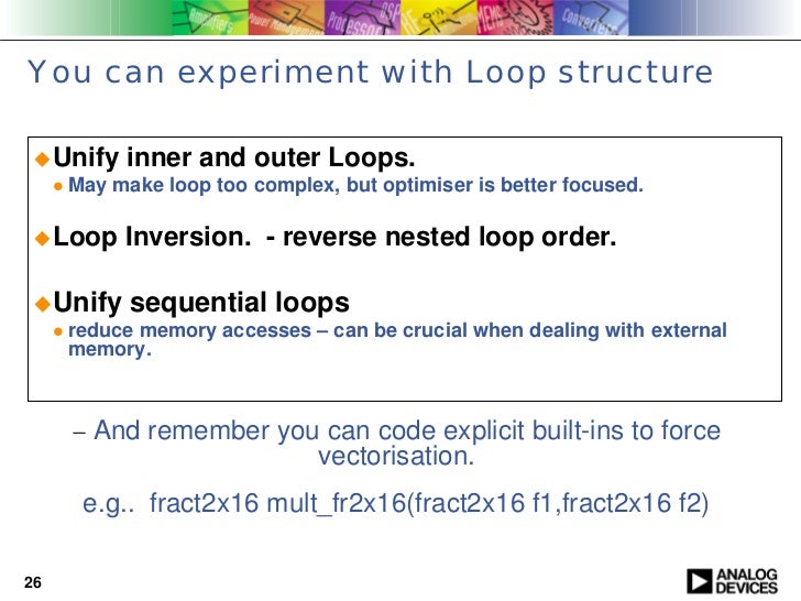 26. 26. You can experiment with Loop structure Unify inner and outer Loops. May make loop too complex, but optimiser is better focused. Loop Inversion. - reverse nested loop order. Unify sequential loops reduce memory accesses – can be crucial when dealing with external memory. − And remember you can code explicit built-ins to force vectorisation. e.g.. fract2x16 mult_fr2x16(fract2x16 f1,fract2x16 f2) 26