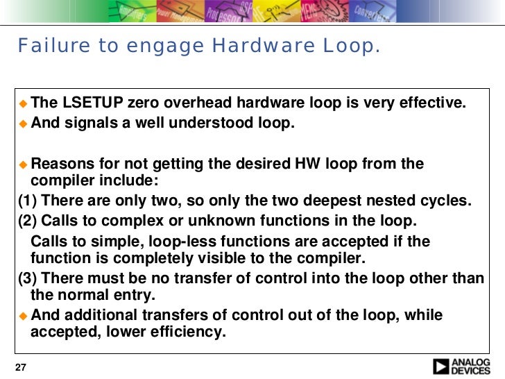 27. 27. Failure to engage Hardware Loop. The LSETUP zero overhead hardware loop is very effective. And signals a well understood loop. Reasons for not getting the desired HW loop from the compiler include: (1) There are only two, so only the two deepest nested cycles. (2) Calls to complex or unknown functions in the loop. Calls to simple, loop-less functions are accepted if the function is completely visible to the compiler. (3) There must be no transfer of control into the loop other than the normal entry. And additional transfers of control out of the loop, while accepted, lower efficiency. 27