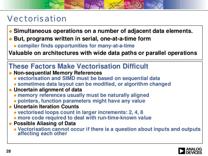 28. 28. Vectorisation Simultaneous operations on a number of adjacent data elements. But, programs written in serial, one-at-a-time form compiler finds opportunities for many-at-a-time Valuable on architectures with wide data paths or parallel operations These Factors Make Vectorisation Difficult Non-sequential Memory References vectorisation and SIMD must be based on sequential data sometimes data layout can be modified, or algorithm changed Uncertain alignment of data memory references usually must be naturally aligned pointers, function parameters might have any value Uncertain Iteration Counts vectorised loops count in larger increments: 2, 4, 8 more code required to deal with run-time-known value Possible Aliasing of Data Vectorisation cannot occur if there is a question about inputs and outputs affecting each other 28