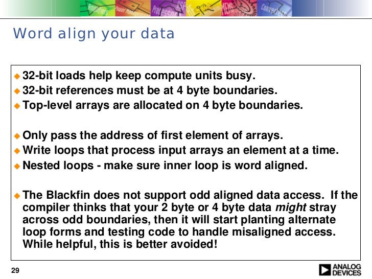 29. 29. Word align your data 32-bit loads help keep compute units busy. 32-bit references must be at 4 byte boundaries. Top-level arrays are allocated on 4 byte boundaries. Only pass the address of first element of arrays. Write loops that process input arrays an element at a time. Nested loops - make sure inner loop is word aligned. The Blackfin does not support odd aligned data access. If the compiler thinks that your 2 byte or 4 byte data might stray across odd boundaries, then it will start planting alternate loop forms and testing code to handle misaligned access. While helpful, this is better avoided! 29