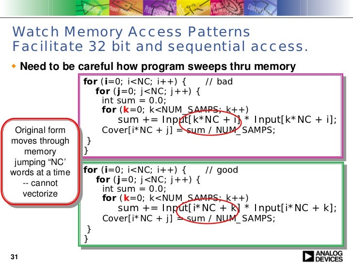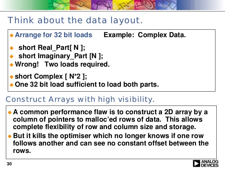 30. 30. Think about the data layout. Arrange for 32 bit loads Example: Complex Data. short Real_Part[ N ]; short Imaginary_Part [N ]; Wrong! Two loads required. short Complex [ N*2 ]; One 32 bit load sufficient to load both parts. Construct Arrays with high visibility. A common performance flaw is to construct a 2D array by a column of pointers to malloc’ed rows of data. This allows complete flexibility of row and column size and storage. But it kills the optimiser which no longer knows if one row follows another and can see no constant offset between the rows. 30