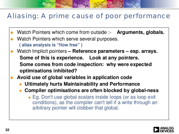 32. 32. Aliasing: A prime cause of poor performance Watch Pointers which come from outside :- Arguments, globals. Watch Pointers which serve several purposes. ( alias analysis is “flow free” ) Watch Implicit pointers – Reference parameters – esp. arrays. Some of this is experience. Look at any pointers. Some comes from code inspection: why were expected optimisations inhibited? Avoid use of global variables in application code Ultimately hurts Maintainability and Performance Compiler optimisations are often blocked by global-ness Eg. Don't use global scalars inside loops (or as loop exit conditions), as the compiler can't tell if a write through an arbitrary pointer will clobber that global. 32