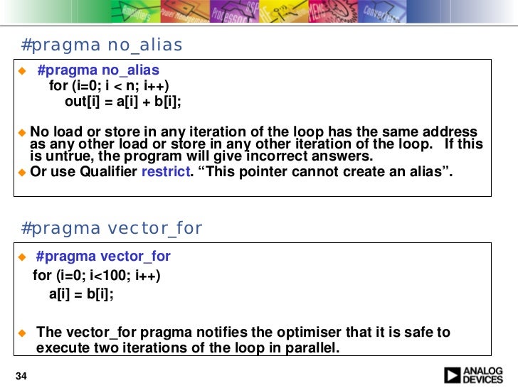 34. 34. #pragma no_alias #pragma no_alias for (i=0; i < n; i++) out[i] = a[i] + b[i]; No load or store in any iteration of the loop has the same address as any other load or store in any other iteration of the loop. If this is untrue, the program will give incorrect answers. Or use Qualifier restrict. “This pointer cannot create an alias”. #pragma vector_for #pragma vector_for for (i=0; i<100; i++) a[i] = b[i]; The vector_for pragma notifies the optimiser that it is safe to execute two iterations of the loop in parallel. 34