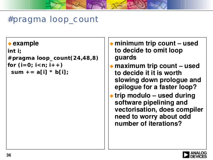 36. 36. #pragma loop_count example minimum trip count – used int i; to decide to omit loop #pragma loop_count(24,48,8) guards for (i=0; i<n; i++) maximum trip count – used sum += a[i] * b[i]; to decide it it is worth slowing down prologue and epilogue for a faster loop? trip modulo – used during software pipelining and vectorisation, does compiler need to worry about odd number of iterations? 36