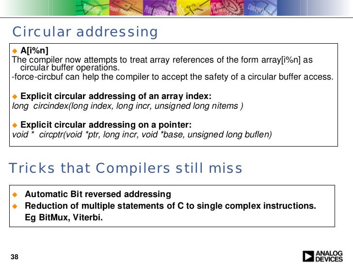 38. 38. Circular addressing A[i%n] The compiler now attempts to treat array references of the form array[i%n] as circular buffer operations. -force-circbuf can help the compiler to accept the safety of a circular buffer access. Explicit circular addressing of an array index: long circindex(long index, long incr, unsigned long nitems ) Explicit circular addressing on a pointer: void * circptr(void *ptr, long incr, void *base, unsigned long buflen) Tricks that Compilers still miss Automatic Bit reversed addressing Reduction of multiple statements of C to single complex instructions. Eg BitMux, Viterbi. 38