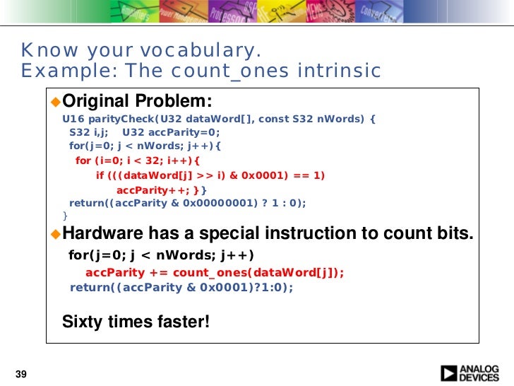 39. 39. Know your vocabulary. Example: The count_ones intrinsic Original Problem: U16 parityCheck(U32 dataWord[], const S32 nWords) { S32 i,j; U32 accParity=0; for(j=0; j < nWords; j++){ for (i=0; i < 32; i++){ if (((dataWord[j] >> i) & 0x0001) == 1) accParity++; }} return((accParity & 0x00000001) ? 1 : 0); } Hardware has a special instruction to count bits. for(j=0; j < nWords; j++) accParity += count_ones(dataWord[j]); return((accParity & 0x0001)?1:0); Sixty times faster! 39