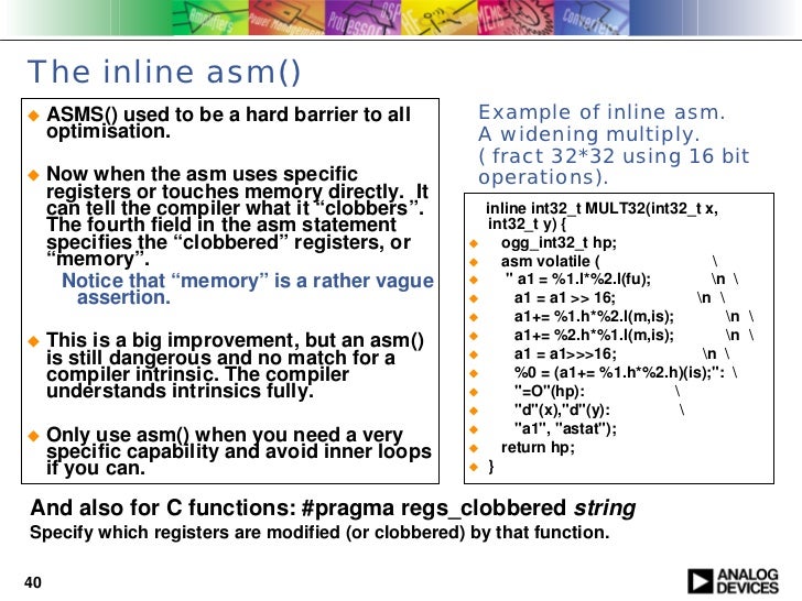 40. 40. The inline asm() ASMS() used to be a hard barrier to all Example of inline asm. optimisation. A widening multiply. ( fract 32*32 using 16 bit Now when the asm uses specific operations). registers or touches memory directly. It can tell the compiler what it “clobbers”. inline int32_t MULT32(int32_t x, The fourth field in the asm statement int32_t y) { specifies the “clobbered” registers, or ogg_int32_t hp; “memory”. asm volatile ( Notice that “memory” is a rather vague " a1 = %1.l*%2.l(fu); n assertion. a1 = a1 >> 16; n a1+= %1.h*%2.l(m,is); n This is a big improvement, but an asm() a1+= %2.h*%1.l(m,is); n is still dangerous and no match for a a1 = a1>>>16; n compiler intrinsic. The compiler %0 = (a1+= %1.h*%2.h)(is);": understands intrinsics fully. "=O"(hp): "d"(x),"d"(y): Only use asm() when you need a very "a1", "astat"); specific capability and avoid inner loops return hp; if you can. } And also for C functions: #pragma regs_clobbered string Specify which registers are modified (or clobbered) by that function. 40