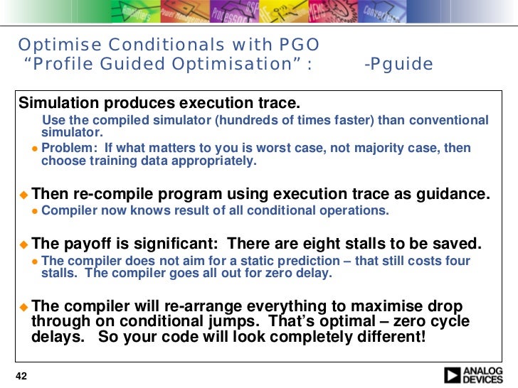 42. 42. Optimise Conditionals with PGO “Profile Guided Optimisation” : -Pguide Simulation produces execution trace. Use the compiled simulator (hundreds of times faster) than conventional simulator. Problem: If what matters to you is worst case, not majority case, then choose training data appropriately. Then re-compile program using execution trace as guidance. Compiler now knows result of all conditional operations. The payoff is significant: There are eight stalls to be saved. The compiler does not aim for a static prediction – that still costs four stalls. The compiler goes all out for zero delay. The compiler will re-arrange everything to maximise drop through on conditional jumps. That’s optimal – zero cycle delays. So your code will look completely different! 42