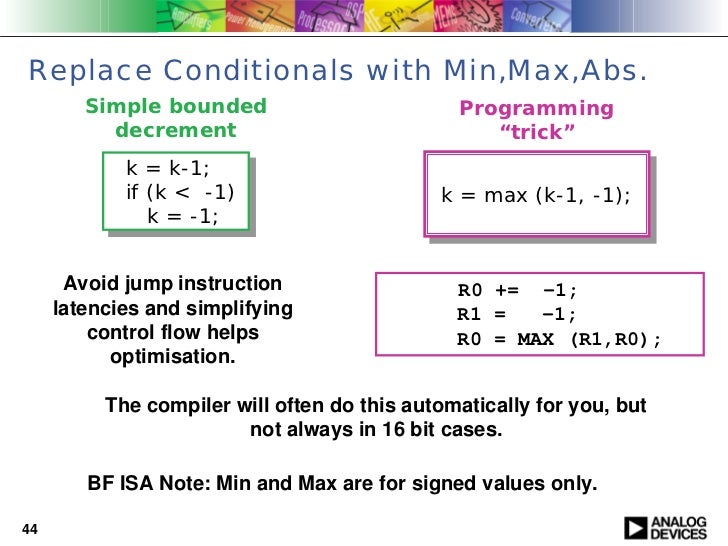 44. 44. Replace Conditionals with Min,Max,Abs. Simple bounded Programming decrement “trick” k = k-1; k = k-1; if (k < -1) if (k < -1) k = max (k-1, -1); k = max (k-1, -1); k = -1; k = -1; Avoid jump instruction R0 += -1; latencies and simplifying R1 = -1; control flow helps R0 = MAX (R1,R0); optimisation. The compiler will often do this automatically for you, but not always in 16 bit cases. BF ISA Note: Min and Max are for signed values only. 44