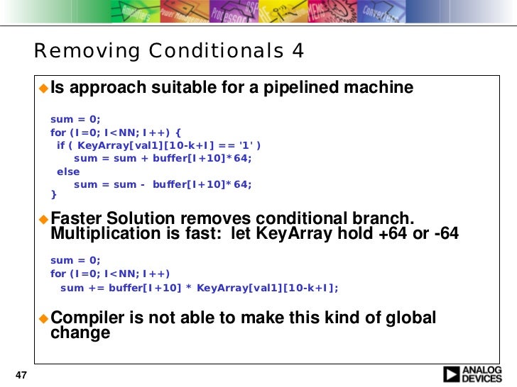 46. 46. Removing Conditionals 3 Predicated Instruction Support The blackfin predicated instruction support takes the form of: IF (CC) reg = reg. Much faster than a conditional branch. ( 1 cycle ) but limited. Recode to show the compiler the opportunity. For instance – consider speculative execution. if (A) X = EXPR1 else X = EXPR2; Becomes: X = EXPR1; IF (!A) X = EXPR2; Or X=EXPR1; Y=EXPR2; if (!A) X=Y; Generally,speculation is dangerous for compilers. Help it out. Eg. Compiler will not risk loading off the end of a buffer for fear of address errors unless you code –extra-loop-loads. 46