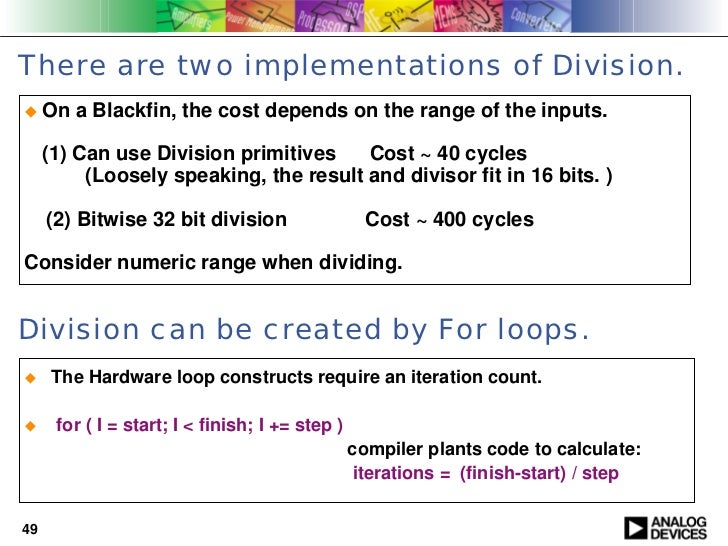 49. 49. There are two implementations of Division. On a Blackfin, the cost depends on the range of the inputs. (1) Can use Division primitives Cost ~ 40 cycles (Loosely speaking, the result and divisor fit in 16 bits. ) (2) Bitwise 32 bit division Cost ~ 400 cycles Consider numeric range when dividing. Division can be created by For loops. The Hardware loop constructs require an iteration count. for ( I = start; I < finish; I += step ) compiler plants code to calculate: iterations = (finish-start) / step 49