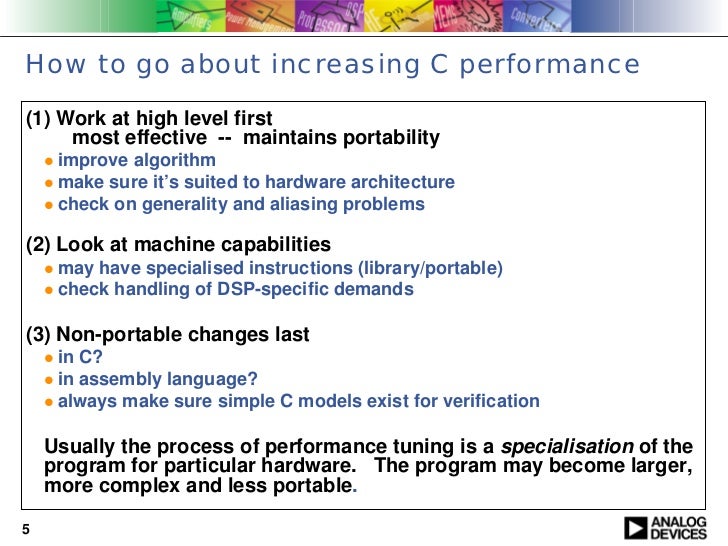4. 4. Why use C? Advantages: C is much cheaper to develop. ( encourages experimentation ) C is much cheaper to maintain. C is comparatively portable. Disadvantages: ANSI C is not designed for DSP. DSP processor designs usually expect assembly in key areas. DSP applications continue to evolve. ( faster than ANSI Standard C ) 4