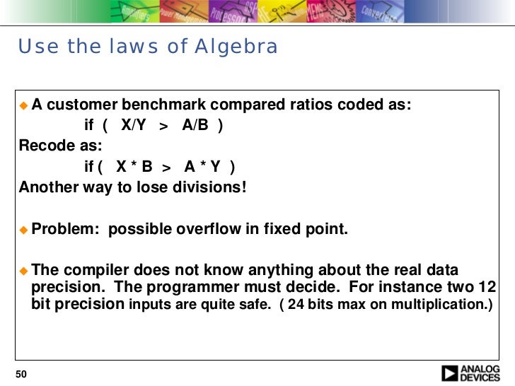 50. 50. Use the laws of Algebra A customer benchmark compared ratios coded as: if ( X/Y > A/B ) Recode as: if ( X * B > A * Y ) Another way to lose divisions! Problem: possible overflow in fixed point. The compiler does not know anything about the real data precision. The programmer must decide. For instance two 12 bit precision inputs are quite safe. ( 24 bits max on multiplication.) 50