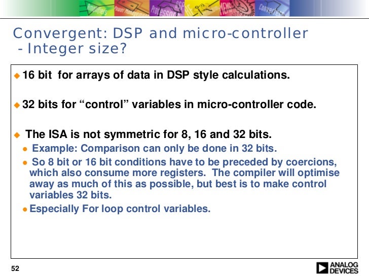 52. 52. Convergent: DSP and micro-controller - Integer size? 16 bit for arrays of data in DSP style calculations. 32 bits for “control” variables in micro-controller code. The ISA is not symmetric for 8, 16 and 32 bits. Example: Comparison can only be done in 32 bits. So 8 bit or 16 bit conditions have to be preceded by coercions, which also consume more registers. The compiler will optimise away as much of this as possible, but best is to make control variables 32 bits. Especially For loop control variables. 52