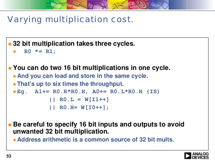 53. 53. Varying multiplication cost. 32 bit multiplication takes three cycles. R0 *= R1; You can do two 16 bit multiplications in one cycle. And you can load and store in the same cycle. That’s up to six times the throughput. Eg. A1+= R0.H*R0.H, A0+= R0.L*R0.H (IS) || R0.L = W[I1++] || R0.H= W[I0++]; Be careful to specify 16 bit inputs and outputs to avoid unwanted 32 bit multiplication. Address arithmetic is a common source of 32 bit mults. 53