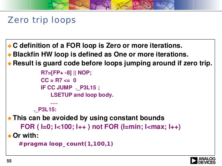 55. 55. Zero trip loops C definition of a FOR loop is Zero or more iterations. Blackfin HW loop is defined as One or more iterations. Result is guard code before loops jumping around if zero trip. R7=[FP+ -8] || NOP; CC = R7 <= 0 IF CC JUMP ._P3L15 ; LSETUP and loop body. …. ._P3L15: This can be avoided by using constant bounds FOR ( I=0; I<100; I++ ) not FOR (I=min; I<max; I++) Or with: #pragma loop_count(1,100,1) 55