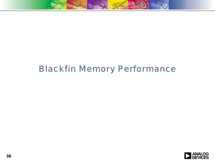 57. 57. Evaluation tip: Watch the Bus speed. Some good CPU/BUS speed settings for Blackfins 30 mhz clock 27 mhz clock DF=1 ( giving 15 mhz granularity ) DF=1 ( giving 13.5 mhz granularity ) CPU Speed Bus speed Bus speed Bus speed CPU Speed Bus speed Bus speed Multiple Div = 4 Div = 5 Div = 6 Multiple 13.5 Div = 3 Div = 4 Div = 5 Div = 6 29 392 130.50 97.88 78.30 65.25 30 450 112.50 90.00 75.00 30 405 101.25 81.00 67.50 31 465 116.25 93.00 77.50 31 419 104.63 83.70 69.75 32 432 108.00 86.40 72.00 32 480 120.00 96.00 80.00 33 446 111.38 89.10 74.25 33 495 123.75 99.00 82.50 34 459 114.75 91.80 76.50 35 473 118.13 94.50 78.75 34 510 127.50 102.00 85.00 36 486 121.50 97.20 81.00 35 525 131.25 105.00 87.50 37 500 124.88 99.90 83.25 38 513 128.25 102.60 85.50 36 540 108.00 90.00 39 527 131.63 105.30 87.75 37 555 111.00 92.50 40 540 108.00 90.00 38 570 114.00 95.00 41 554 110.70 92.25 39 585 117.00 97.50 42 567 113.40 94.50 40 600 120.00 100.00 43 581 116.10 96.75 41 615 123.00 102.50 44 594 118.80 99.00 45 608 121.50 101.25 42 630 126.00 105.00 46 621 124.20 103.50 43 645 129.00 107.50 47 635 126.90 105.75 44 660 132.00 110.00 49 662 132.30 110.25 50 675 112.50 45 675 112.50 51 689 114.75 46 690 115.00 52 702 117.00 47 705 117.50 53 716 119.25 54 729 121.50 49 735 122.50 55 743 123.75 50 750 125.00 56 756 126.00 57