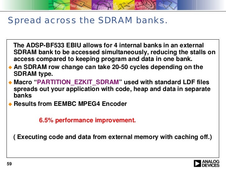 59. 59. Spread across the SDRAM banks. The ADSP-BF533 EBIU allows for 4 internal banks in an external SDRAM bank to be accessed simultaneously, reducing the stalls on access compared to keeping program and data in one bank. An SDRAM row change can take 20-50 cycles depending on the SDRAM type. Macro “PARTITION_EZKIT_SDRAM” used with standard LDF files spreads out your application with code, heap and data in separate banks Results from EEMBC MPEG4 Encoder 6.5% performance improvement. ( Executing code and data from external memory with caching off.) 59