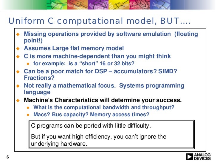 6. 6. Uniform C computational model, BUT…. Missing operations provided by software emulation (floating point!) Assumes Large flat memory model C is more machine-dependent than you might think for example: is a “short” 16 or 32 bits? Can be a poor match for DSP – accumulators? SIMD? Fractions? Not really a mathematical focus. Systems programming language Machine’s Characteristics will determine your success. What is the computational bandwidth and throughput? Macs? Bus capacity? Memory access times? C programs can be ported with little difficulty. But if you want high efficiency, you can’t ignore the underlying hardware. 6
