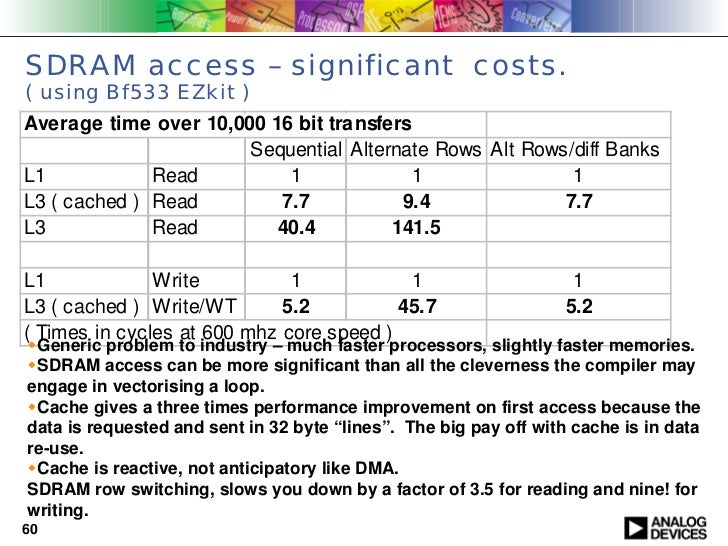 60. 60. SDRAM access – significant costs. ( using Bf533 EZkit ) Average time over 10,000 16 bit transfers Sequential Alternate Rows Alt Rows/diff Banks L1 Read 1 1 1 L3 ( cached ) Read 7.7 9.4 7.7 L3 Read 40.4 141.5 L1 Write 1 1 1 L3 ( cached ) Write/WT 5.2 45.7 5.2 ( Times in cycles at 600 mhz core speed ) Generic problem to industry – much faster processors, slightly faster memories. SDRAM access can be more significant than all the cleverness the compiler may engage in vectorising a loop. Cache gives a three times performance improvement on first access because the data is requested and sent in 32 byte “lines”. The big pay off with cache is in data re-use. Cache is reactive, not anticipatory like DMA. SDRAM row switching, slows you down by a factor of 3.5 for reading and nine! for writing. 60