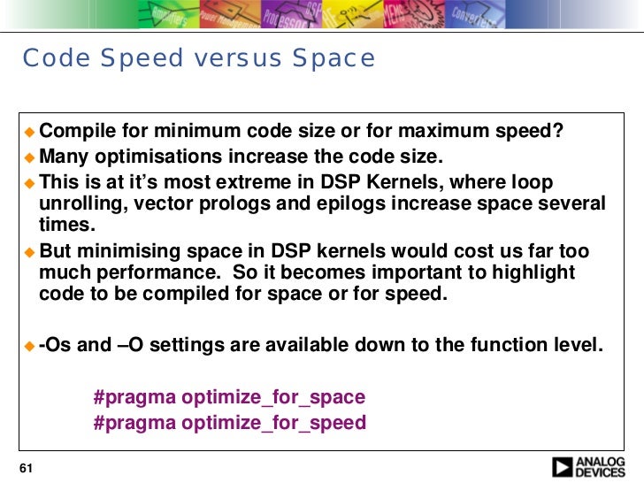61. 61. Code Speed versus Space Compile for minimum code size or for maximum speed? Many optimisations increase the code size. This is at it’s most extreme in DSP Kernels, where loop unrolling, vector prologs and epilogs increase space several times. But minimising space in DSP kernels would cost us far too much performance. So it becomes important to highlight code to be compiled for space or for speed. -Os and –O settings are available down to the function level. #pragma optimize_for_space #pragma optimize_for_speed 61