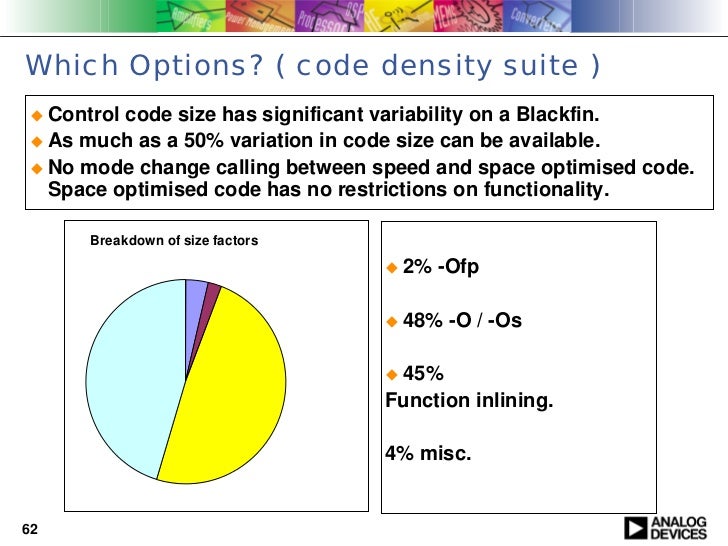 62. 62. Which Options? ( code density suite ) Control code size has significant variability on a Blackfin. As much as a 50% variation in code size can be available. No mode change calling between speed and space optimised code. Space optimised code has no restrictions on functionality. Breakdown of size factors 2% -Ofp 48% -O / -Os 45% Function inlining. 4% misc. 62