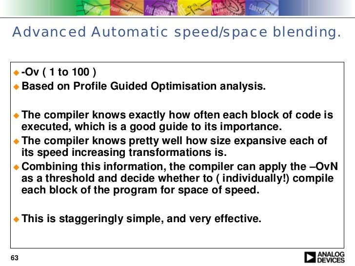 63. 63. Advanced Automatic speed/space blending. -Ov ( 1 to 100 ) Based on Profile Guided Optimisation analysis. The compiler knows exactly how often each block of code is executed, which is a good guide to its importance. The compiler knows pretty well how size expansive each of its speed increasing transformations is. Combining this information, the compiler can apply the –OvN as a threshold and decide whether to ( individually!) compile each block of the program for space of speed. This is staggeringly simple, and very effective. 63
