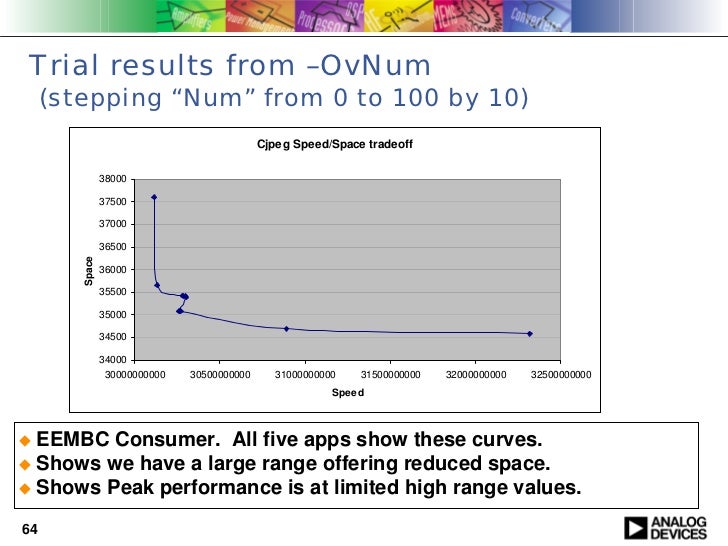 64. 64. Trial results from –OvNum (stepping “Num” from 0 to 100 by 10) Cjpeg Speed/Space tradeoff 38000 37500 37000 36500 Space 36000 35500 35000 34500 34000 30000000000 30500000000 31000000000 31500000000 32000000000 32500000000 Speed EEMBC Consumer. All five apps show these curves. Shows we have a large range offering reduced space. Shows Peak performance is at limited high range values. 64
