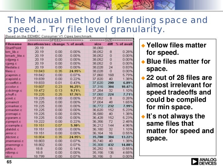 65. 65. The Manual method of blending space and speed. – Try file level granularity. Yellow files matter for speed. Blue files matter for space. 22 out of 28 files are almost irrelevant for speed tradeoffs and could be compiled for min space. It’s not always the same files that matter for speed and space. 65