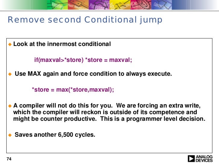 72. 72. Problem #2: Conditional jumps found in critical loop short corr_max(DATA *corr_up,DATA *corr_down,DATA *store,DATA gate_level, ushort nx) { int j; for (j=0;j<len;j++) { DATA maxval; // DATA is 16 bits. maxval = *corr_up++; if(*corr_down>maxval) maxval = *corr_down; corr_down++; if(maxval>gate_level) { if(maxval>*store) *store = maxval; } store++; } return 0; } What’s wrong with this? Three conditional jumps inside a loop! Initial cost 67,000 cycles for this subsection, mostly jump stalls. 72