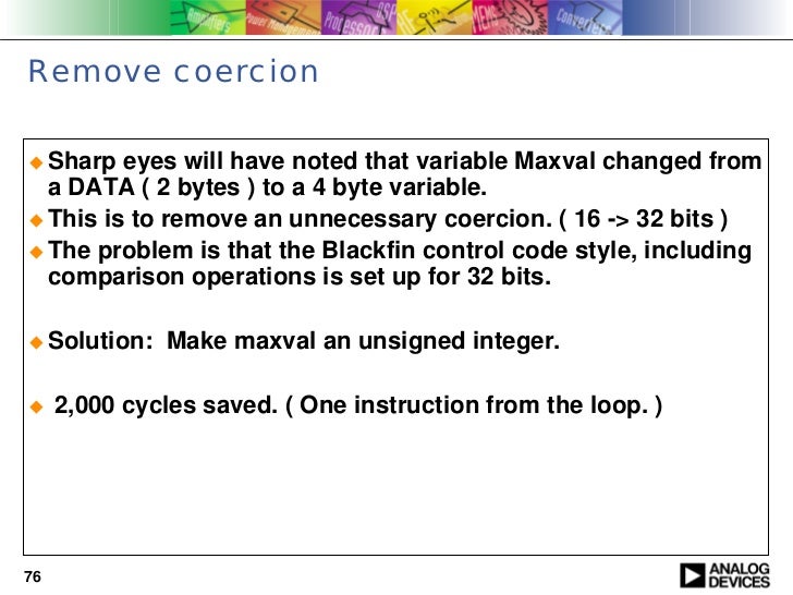 76. 76. Remove coercion Sharp eyes will have noted that variable Maxval changed from a DATA ( 2 bytes ) to a 4 byte variable. This is to remove an unnecessary coercion. ( 16 -> 32 bits ) The problem is that the Blackfin control code style, including comparison operations is set up for 32 bits. Solution: Make maxval an unsigned integer. 2,000 cycles saved. ( One instruction from the loop. ) 76