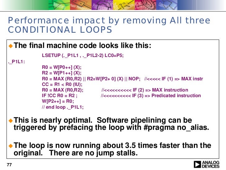 77. 77. Performance impact by removing All three CONDITIONAL LOOPS The final machine code looks like this: LSETUP (._P1L1 , ._P1L2-2) LC0=P5; ._P1L1: R0 = W[P0++] (X); R2 = W[P1++] (X); R0 = MAX (R0,R2) || R2=W[P2+ 0] (X) || NOP; //<<<<< IF (1) => MAX instr CC = R1 < R0 (IU); R0 = MAX (R0,R2); //<<<<<<<<<< IF (2) => MAX instruction IF !CC R0 = R2 ; //<<<<<<<<<< IF (3) => Predicated instruction W[P2++] = R0; // end loop ._P1L1; This is nearly optimal. Software pipelining can be triggered by prefacing the loop with #pragma no_alias. The loop is now running about 3.5 times faster than the original. There are no jump stalls. 77