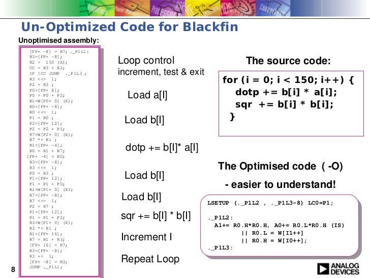 8. 8. Un-Optimized Code for Blackfin Unoptimised assembly: [FP+ -8] = R7; ._P1L1: R3=[FP+ -8]; R7; ._P1L1: [FP+ -8] = R3=[FP+ -8]; R2 = 150 (X); R2 = 150 (X); Loop control The source code: CC = R3 < R2; CC = R3 < R2; IF !CC JUMP ._P1L3 ; increment, test & exit for (i = 0; i < 150; i++) { IF !CC JUMP ._P1L3 ; R3 <<= 1; R3 <<= 1; P2 = R3 ; P2 = R3 ; P0=[FP+ 8]; P0=[FP+ 8]; P0 = P0 + P2; Load a[I] dotp += b[i] * a[i]; P0 = P0 + P2; sqr += b[i] * b[i]; R1=W[P0+ 0] (X); R1=W[P0+ 0] (X); R0=[FP+ -8]; R0=[FP+ -8]; } R0 <<= 1; R0 <<= 1; P1 = R0 ; P1 = R0 ; P2=[FP+ 12]; P2=[FP+ 12]; Load b[I] P2 = P2 + P1; P2 = P2 + P1; R7=W[P2+ 0] (X); R7=W[P2+ 0] (X); R7 *= R1 ; R7 *= R1 ; R1=[FP+ -4]; R1=[FP+ -4]; R0 = R1 + R7; R0 = R1 + R7; dotp += b[I]* a[I] [FP+ -4] = R0; [FP+ -4] = R0; R3=[FP+ -8]; R3=[FP+ -8]; R3 <<= 1; R3 <<= 1; The Optimised code ( -O) P0 = R3 ; P0 = R3 ; P1=[FP+ 12]; P1=[FP+ 12]; Load b[I] P1 = P1 + P0; P1 = P1 + P0; R1=W[P1+ 0] (X); - easier to understand! R1=W[P1+ 0] (X); R7=[FP+ -8]; R7=[FP+ -8]; R7 <<= 1; R7 <<= 1; Load b[I] LSETUP (._P1L2 ,, ._P1L3-8) LC0=P1; P2 = R7 ; P2 = R7 ; LSETUP (._P1L2 ._P1L3-8) LC0=P1; P1=[FP+ 12]; P1=[FP+ 12]; P1 = P1 + P2; P1 = P1 + P2; sqr += b[I] * b[I] ._P1L2: ._P1L2: R3=W[P1+ 0] (X); R3=W[P1+ 0] (X); A1+= R0.H*R0.H, A0+= R0.L*R0.H (IS) R3 *= R1 ; R3 *= R1 ; A1+= R0.H*R0.H, A0+= R0.L*R0.H (IS) R1=[FP+ 16]; || R0.L == W[I1++] R1=[FP+ 16]; R7 = R1 + R3; R7 = R1 + R3; Increment I || R0.L W[I1++] || R0.H == W[I0++]; || R0.H W[I0++]; [FP+ 16] = R7; [FP+ 16] = R7; ._P1L3: R3=[FP+ -8]; R3=[FP+ -8]; ._P1L3: R3 += 1; R3 += 1; [FP+ -8] = R3; [FP+ -8] = R3; Repeat Loop JUMP ._P1L1; 8 JUMP ._P1L1;