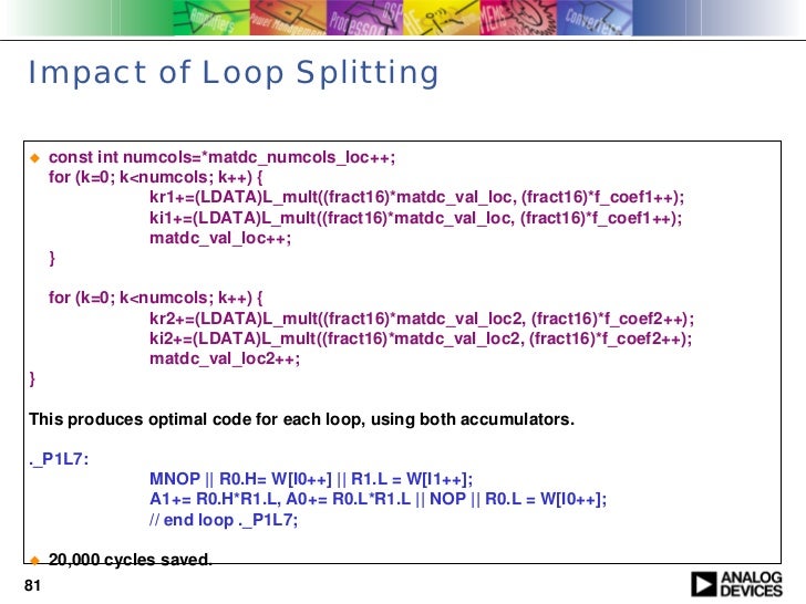 80. 80. Problem #4: Loop Splitting? for (k=0; k<numcols; k++) { kr1+=(LDATA)L_mult((fract16)*matdc_val_loc, (fract16)*f_coef1++); ki1+=(LDATA)L_mult((fract16)*matdc_val_loc, (fract16)*f_coef1++); kr2+=(LDATA)L_mult((fract16)*matdc_val_loc, (fract16)*f_coef2++); ki2+=(LDATA)L_mult((fract16)*matdc_val_loc, (fract16)*f_coef2++); matdc_val_loc++; } The Blackfin has dual accumulators, but the compiler is only using one in processing this code. The problem may be complexity or too many active pointers whose range is not obvious to the compiler ( ie. An aliasing problem. ) Consider: Split into two simpler loops. 80