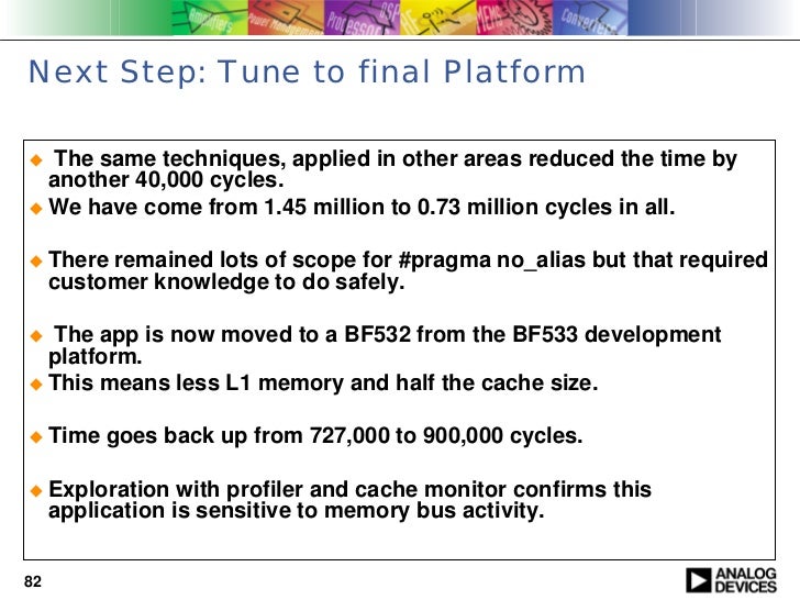 82. 82. Next Step: Tune to final Platform The same techniques, applied in other areas reduced the time by another 40,000 cycles. We have come from 1.45 million to 0.73 million cycles in all. There remained lots of scope for #pragma no_alias but that required customer knowledge to do safely. The app is now moved to a BF532 from the BF533 development platform. This means less L1 memory and half the cache size. Time goes back up from 727,000 to 900,000 cycles. Exploration with profiler and cache monitor confirms this application is sensitive to memory bus activity. 82