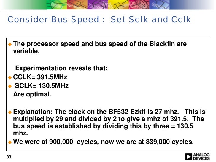 83. 83. Consider Bus Speed : Set Sclk and Cclk The processor speed and bus speed of the Blackfin are variable. Experimentation reveals that: CCLK= 391.5MHz SCLK= 130.5MHz Are optimal. Explanation: The clock on the BF532 Ezkit is 27 mhz. This is multiplied by 29 and divided by 2 to give a mhz of 391.5. The bus speed is established by dividing this by three = 130.5 mhz. We were at 900,000 cycles, now we are at 839,000 cycles. 83