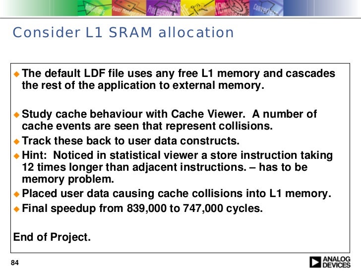 84. 84. Consider L1 SRAM allocation The default LDF file uses any free L1 memory and cascades the rest of the application to external memory. Study cache behaviour with Cache Viewer. A number of cache events are seen that represent collisions. Track these back to user data constructs. Hint: Noticed in statistical viewer a store instruction taking 12 times longer than adjacent instructions. – has to be memory problem. Placed user data causing cache collisions into L1 memory. Final speedup from 839,000 to 747,000 cycles. End of Project. 84