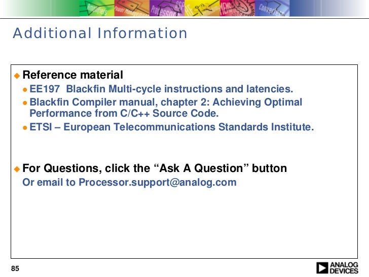 85. 85. Additional Information Reference material EE197 Blackfin Multi-cycle instructions and latencies. Blackfin Compiler manual, chapter 2: Achieving Optimal Performance from C/C++ Source Code. ETSI – European Telecommunications Standards Institute. For Questions, click the “Ask A Question” button Or email to Processor.support@analog.com 85