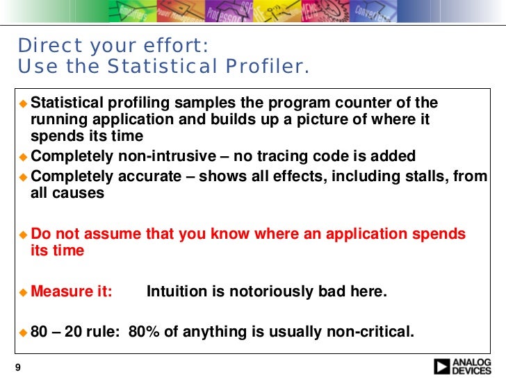 9. 9. Direct your effort: Use the Statistical Profiler. Statistical profiling samples the program counter of the running application and builds up a picture of where it spends its time Completely non-intrusive – no tracing code is added Completely accurate – shows all effects, including stalls, from all causes Do not assume that you know where an application spends its time Measure it: Intuition is notoriously bad here. 80 – 20 rule: 80% of anything is usually non-critical. 9