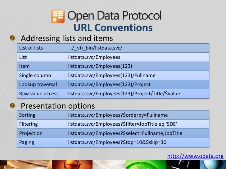 Projection listdata.svc/Employees?$select=Fullname,JobTitle