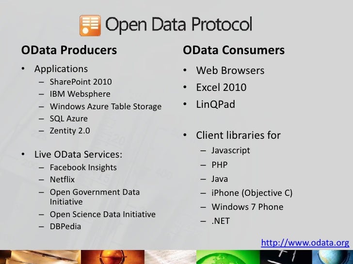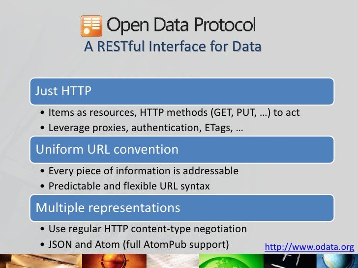 • JSON and Atom (full AtomPub support) http://www.odata.org