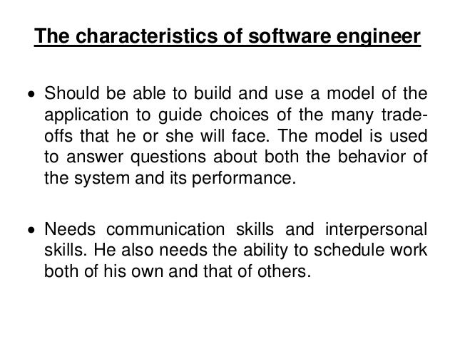11. 11. The characteristics of software engineer • Should be able to build and use a model of the application to guide choices of the many trade- offs that he or she will face. The model is used to answer questions about both the behavior of the system and its performance. • Needs communication skills and interpersonal skills. He also needs the ability to schedule work both of his own and that of others.
