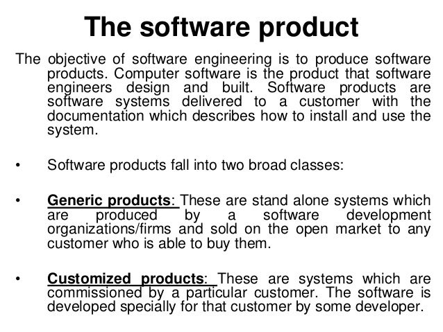 14. 14. The software product The objective of software engineering is to produce software products. Computer software is the product that software engineers design and built. Software products are software systems delivered to a customer with the documentation which describes how to install and use the system. • Software products fall into two broad classes: • Generic products: These are stand alone systems which are produced by a software development organizations/firms and sold on the open market to any customer who is able to buy them. • Customized products: These are systems which are commissioned by a particular customer. The software is developed specially for that customer by some developer.