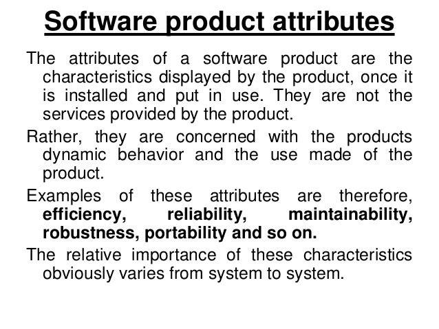 17. 17. Software product attributes The attributes of a software product are the characteristics displayed by the product, once it is installed and put in use. They are not the services provided by the product. Rather, they are concerned with the products dynamic behavior and the use made of the product. Examples of these attributes are therefore, efficiency, reliability, maintainability, robustness, portability and so on. The relative importance of these characteristics obviously varies from system to system.