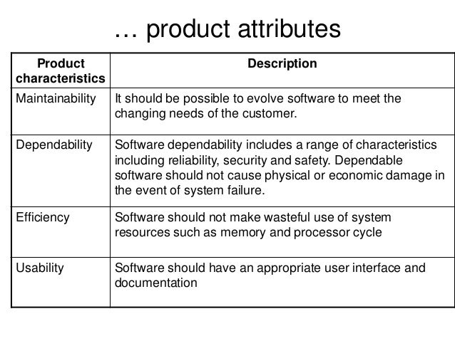 18. 18. … product attributes Product characteristics Description Maintainability It should be possible to evolve software to meet the changing needs of the customer. Dependability Software dependability includes a range of characteristics including reliability, security and safety. Dependable software should not cause physical or economic damage in the event of system failure. Efficiency Software should not make wasteful use of system resources such as memory and processor cycle Usability Software should have an appropriate user interface and documentation