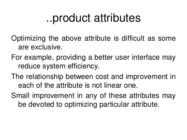 19. 19. ..product attributes Optimizing the above attribute is difficult as some are exclusive. For example, providing a better user interface may reduce system efficiency. The relationship between cost and improvement in each of the attribute is not linear one. Small improvement in any of these attributes may be devoted to optimizing particular attribute.
