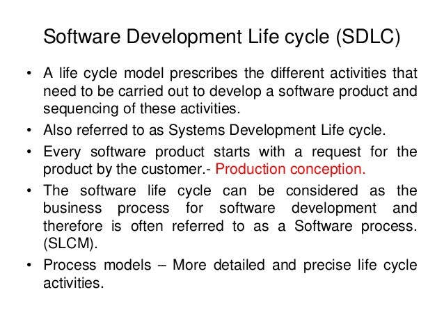 24. 24. Software Development Life cycle (SDLC) • A life cycle model prescribes the different activities that need to be carried out to develop a software product and sequencing of these activities. • Also referred to as Systems Development Life cycle. • Every software product starts with a request for the product by the customer.- Production conception. • The software life cycle can be considered as the business process for software development and therefore is often referred to as a Software process. (SLCM). • Process models – More detailed and precise life cycle activities.