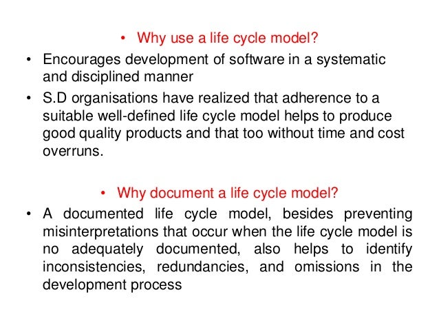 26. 26. • Why use a life cycle model? • Encourages development of software in a systematic and disciplined manner • S.D organisations have realized that adherence to a suitable well-defined life cycle model helps to produce good quality products and that too without time and cost overruns. • Why document a life cycle model? • A documented life cycle model, besides preventing misinterpretations that occur when the life cycle model is no adequately documented, also helps to identify inconsistencies, redundancies, and omissions in the development process